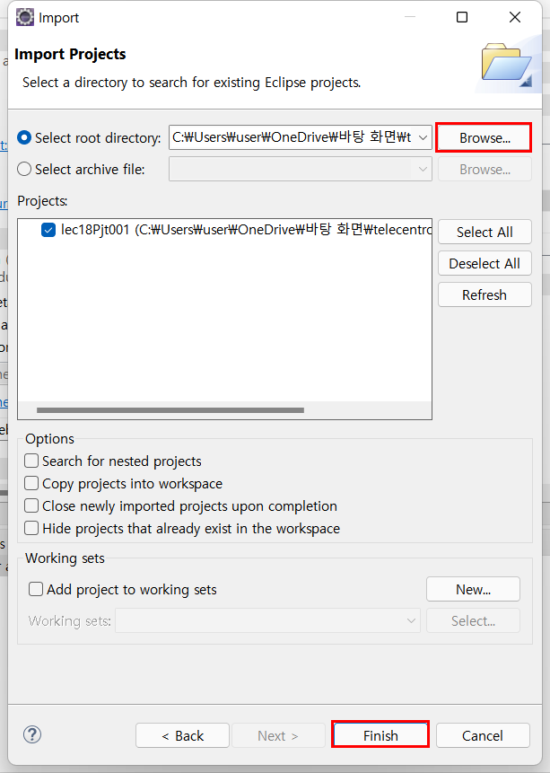 General에 Existing Projects into Workspace를 눌러줍니다.