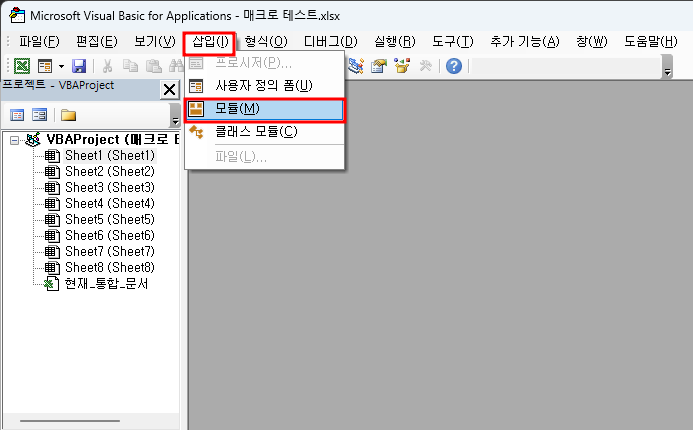 2. '삽입' -> '모듈'을 클릭하여 새 모듈을 추가합니다.