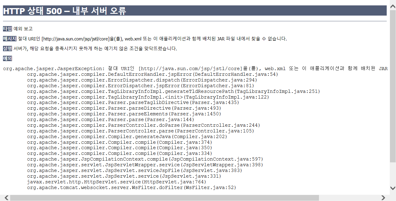 절대 URI인 [http://java.sun.com/jsp/jstl/core]을(를), web.xml?또는 이 애플리케이션과 함께 배치된 JAR 파일 내에서 찾을 수 없습니다.