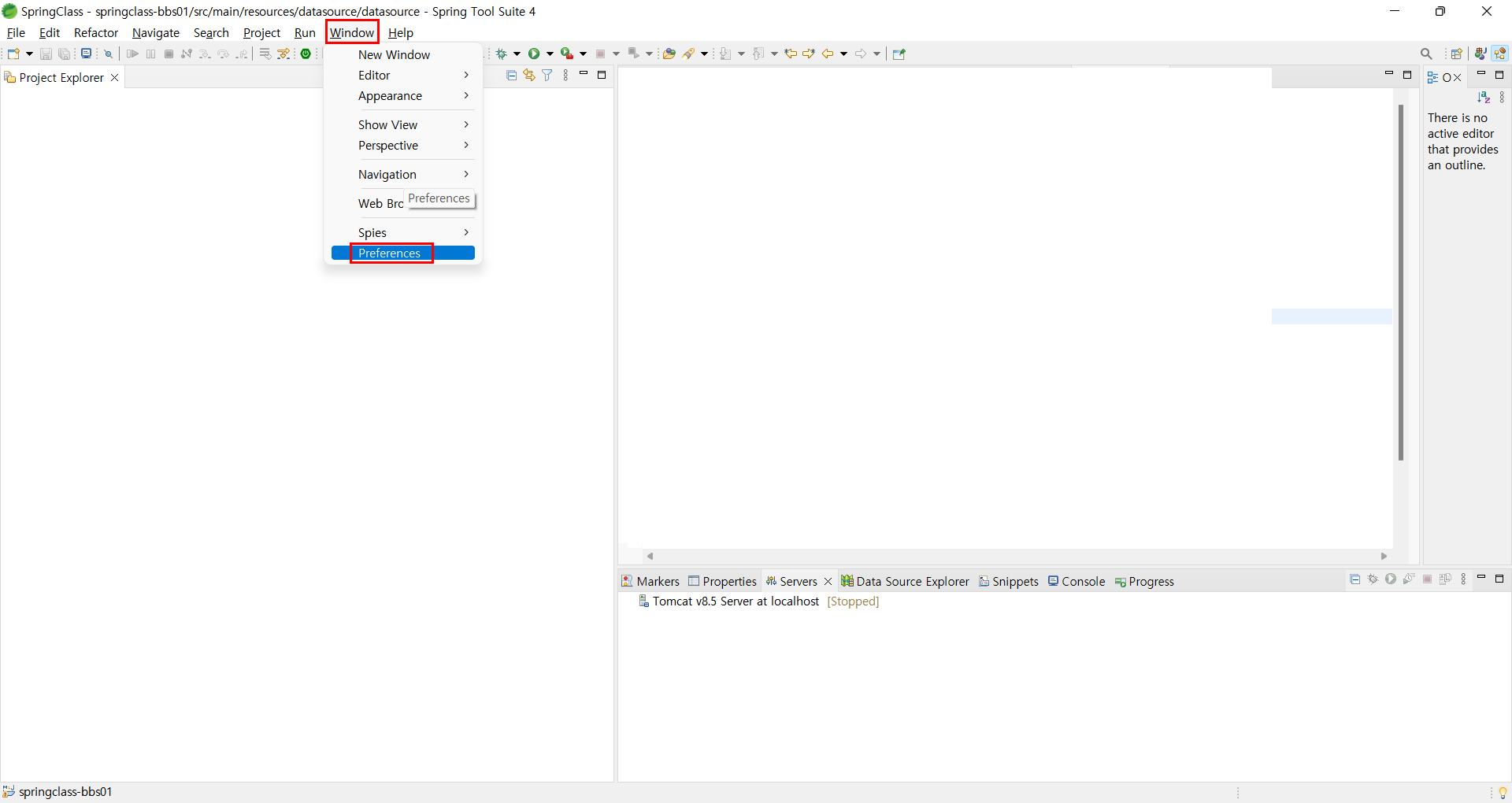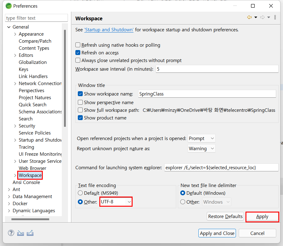 Workspace => Other : UTF-8 => Apply를 해줍니다.
