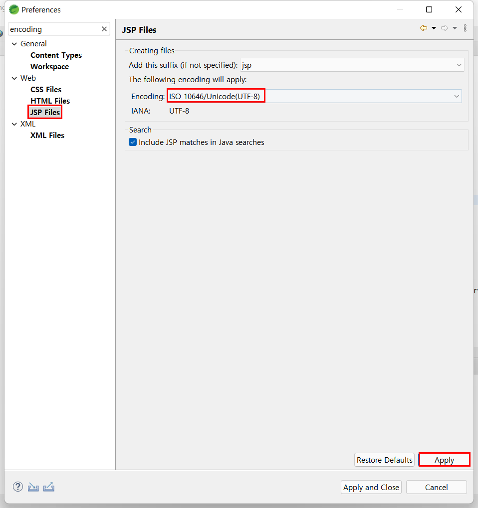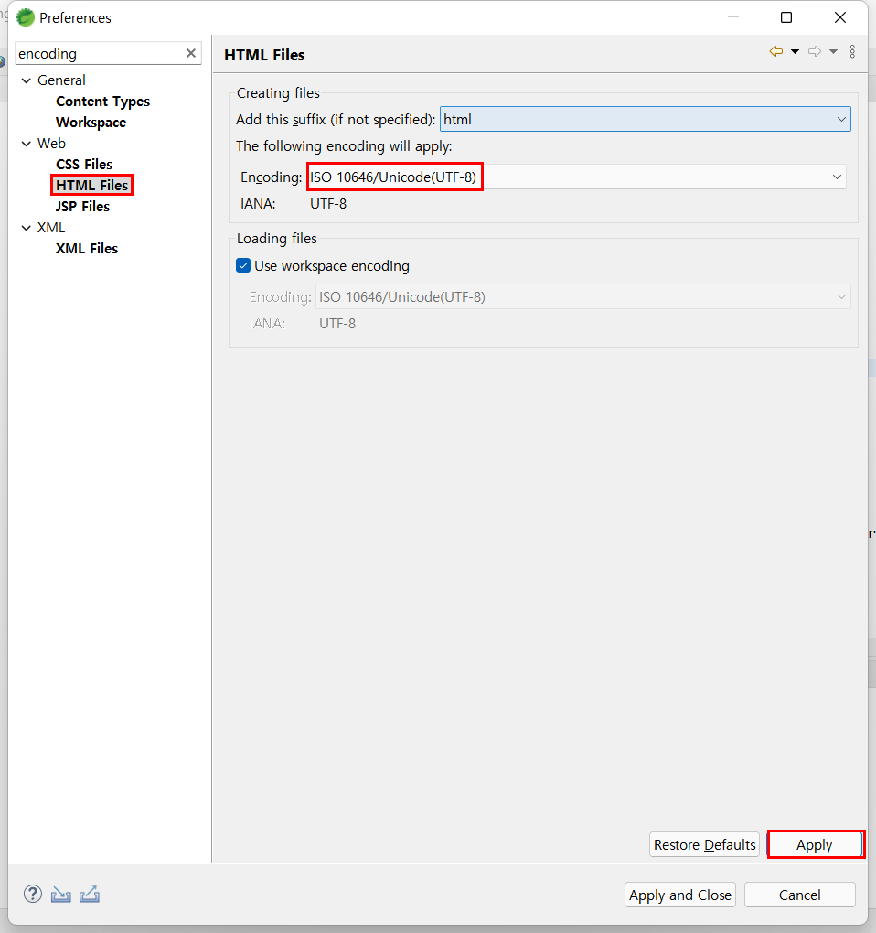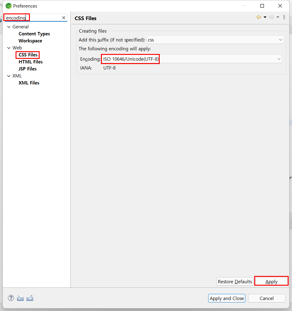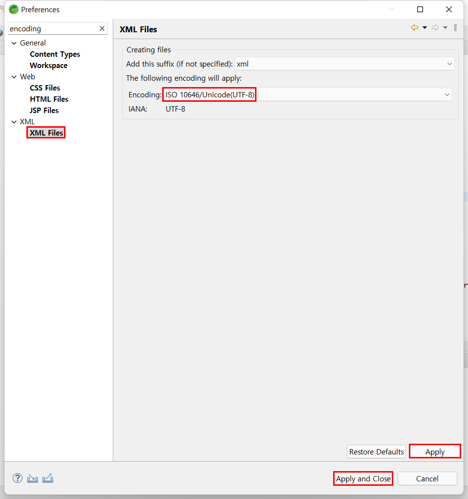 XML Files => Encoding : ISO 10646/Unicode(UTF-8) => Apply => Apply and Close를 눌러줍니다~