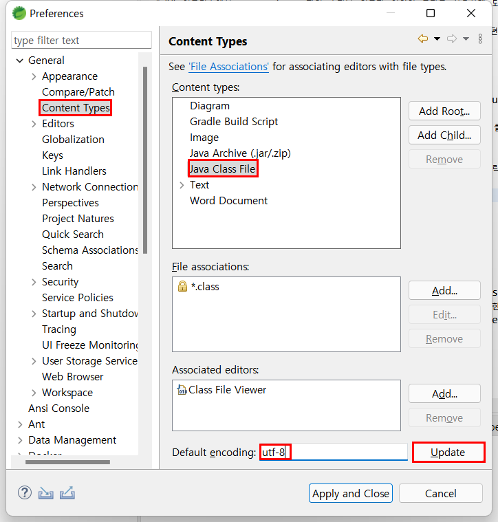 Content Types => Java Class File => utf-8 => Update를 해주세요