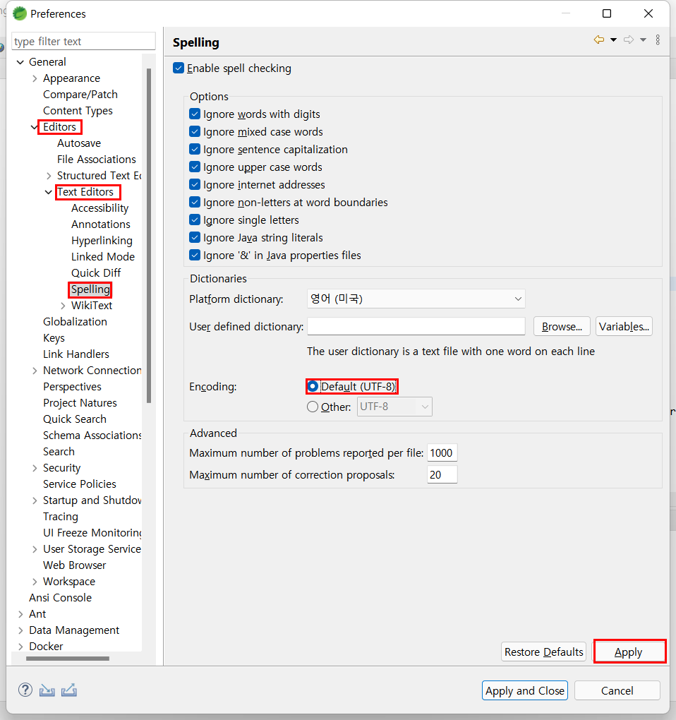 Editors => Text Editors => Spelling => Default (UTF-8) => Apply를 해주세요.