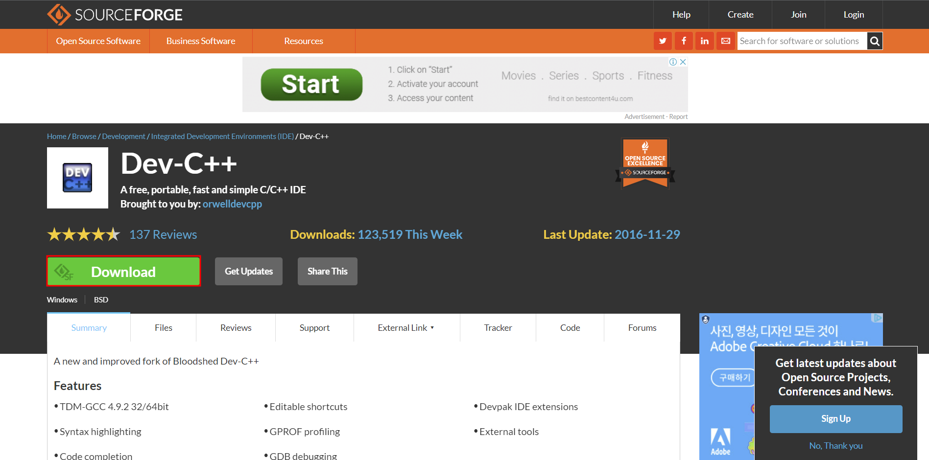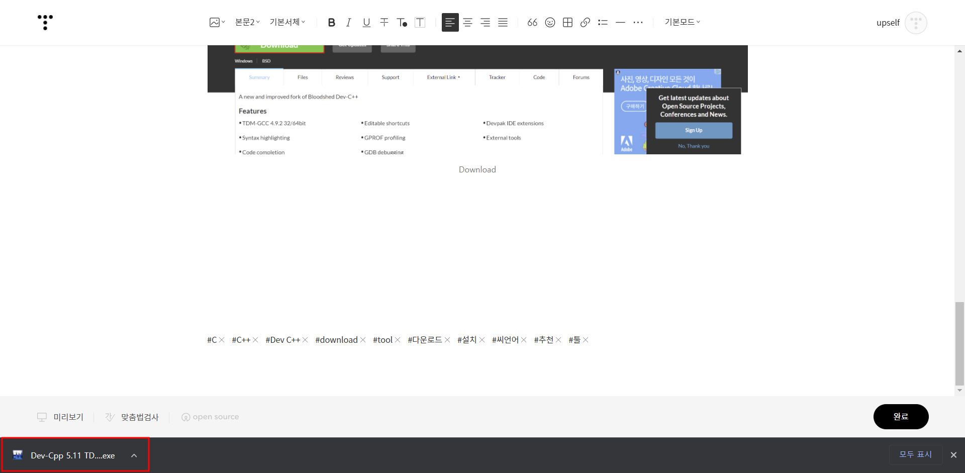 설치가 다 되면 하단에 Dev-Cpp 5.11 TDM-GCC 4.9.2 Setup.exe를 눌러주세요.