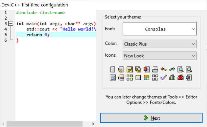 Dev-C++ 사용에 도움이 필요하면 도움말 메뉴의 Dev-C++ 도움말 파일을 참조하거나 개발자에게 메시지를 보내십시오(그는 상관하지 않아요!).