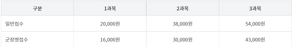 1과목만 신청했을 경우 20,000원, 2과목은 38,000원, 3과목은 54,000원입니다.