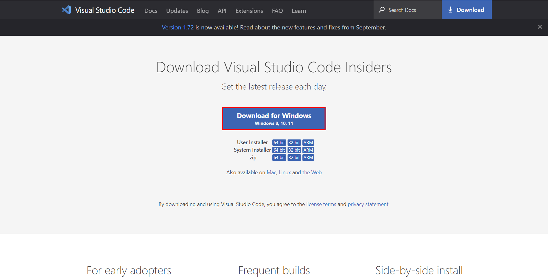 For early adopters, you can get the latest release of VS Code each day with the Insiders Build. Available on Mac, Linux and Windows.