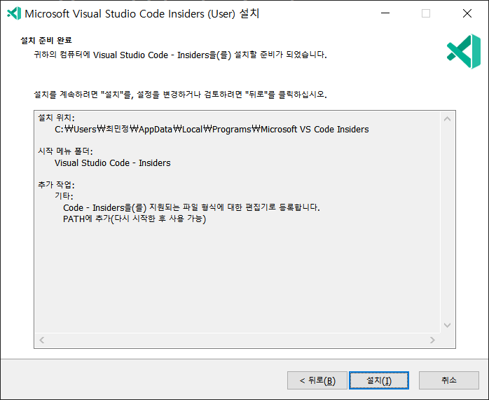 설정 경로 및 기능을 정했으면 설치를 해주시면 됩니다.