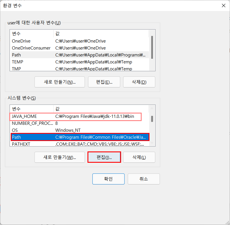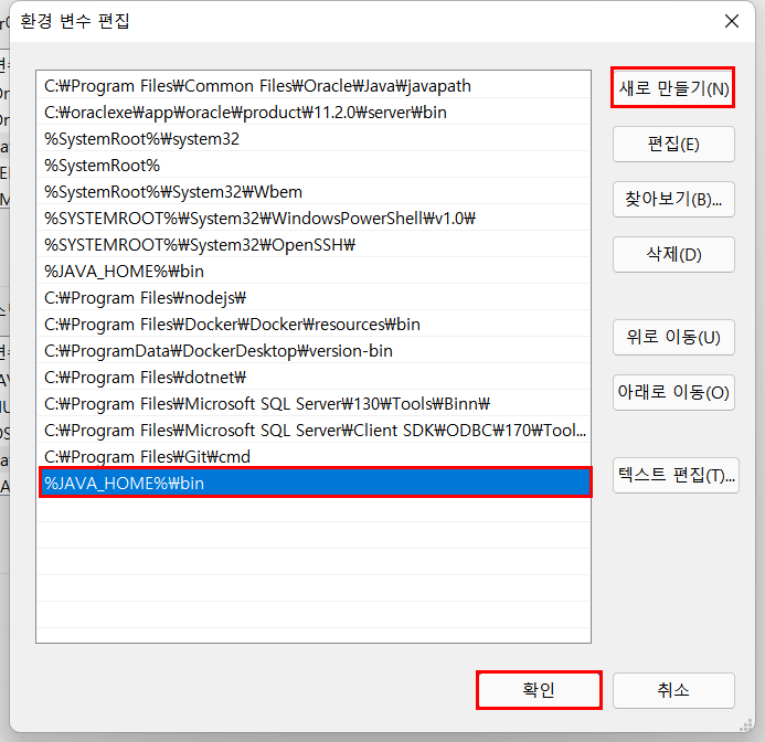 새로 만들기 → %JAVA_HOME%\bin → 확인