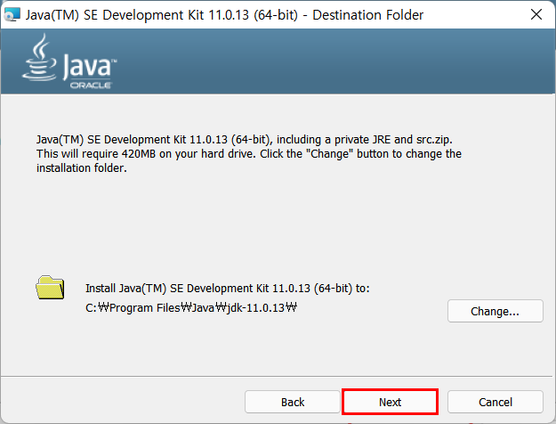 JDK 설치 경로를 변경하고 싶으면 Change 버튼을 누르라고