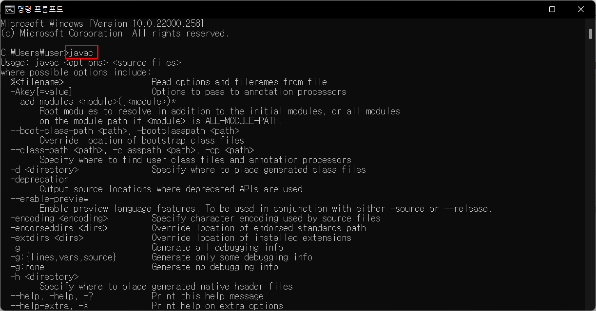 설정이 다 끝났으면 cmd창에서 javac쓰고 실행되는지 확인!!