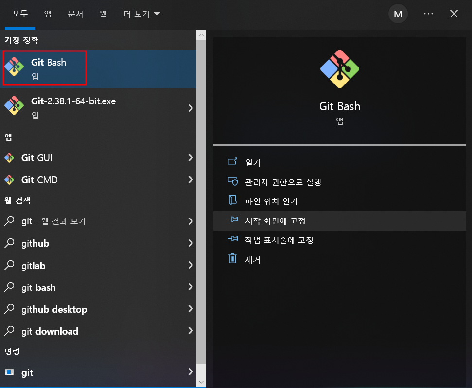 아래와 같이 git을 검색했을 때 잘 실행이 된다면 설치가 된 것입니다~