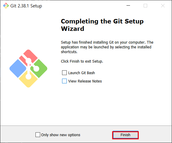 컴퓨터에 Git 설치가 완료되었습니다. 설치된 바로 가기를 선택하여 응용 프로그램을 시작할 수 있습니다.