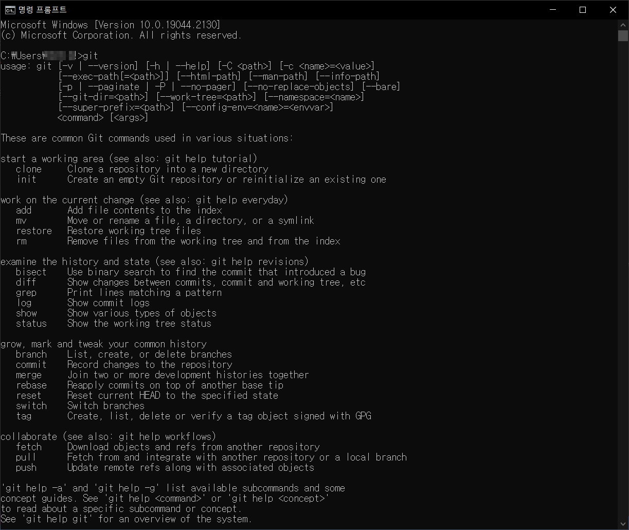 마지막으로 cmd 창에서 git이 잘 설치되었는지 확인해 볼게요!