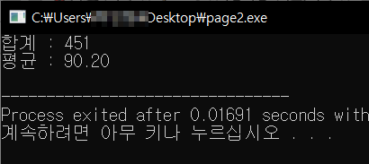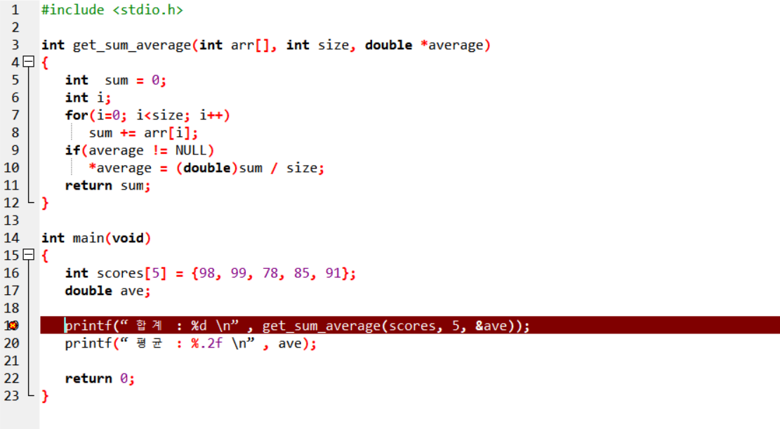 printf("합계 : %d \n", get_sum_average(scores, 5, &ave));