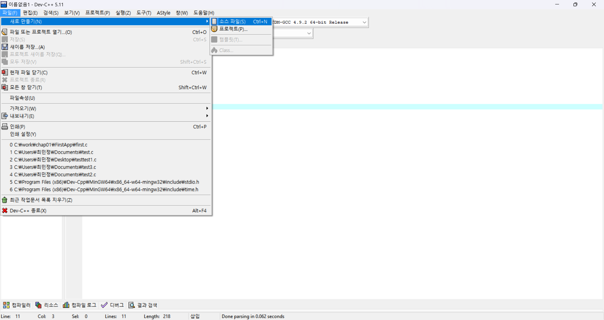 ⑷ 소스 파일 코드#include <stdio.h> int main(void){ printf("FirstApp 프로그래밍\n"); printf("작성자: 청전아\n"); printf("버전: 1.0\n"); return 0; }