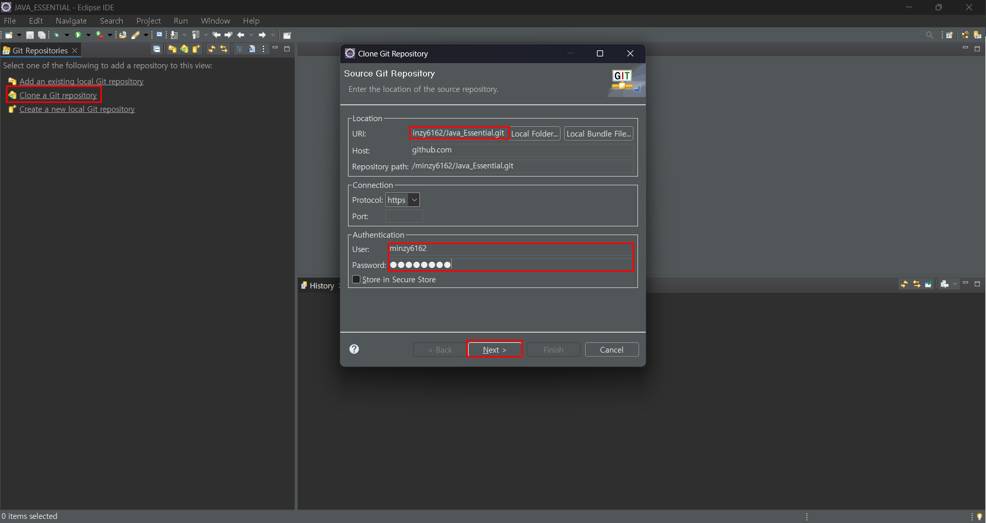 아까 Github에서 복사해둔 경로는 붙여넣어 주고, 계정 ID와 PW를 작성해줍니다.