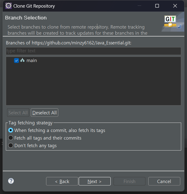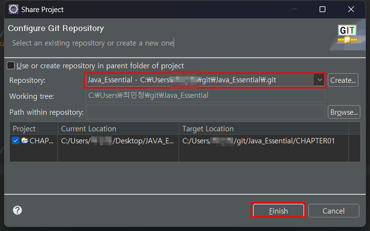 리포지토리 선택 후 Fingsh를 눌러주세요.