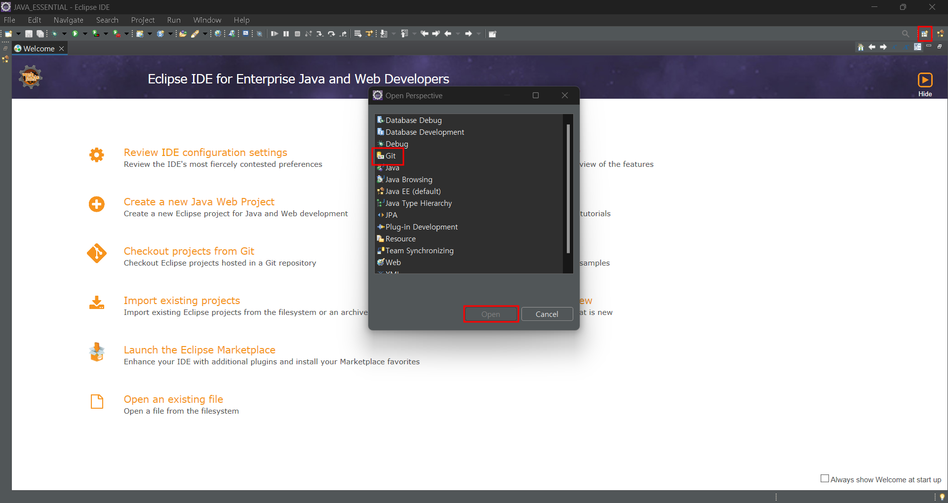 왼쪽 상단에 Open Perspective의 Git을 눌러줍니다.