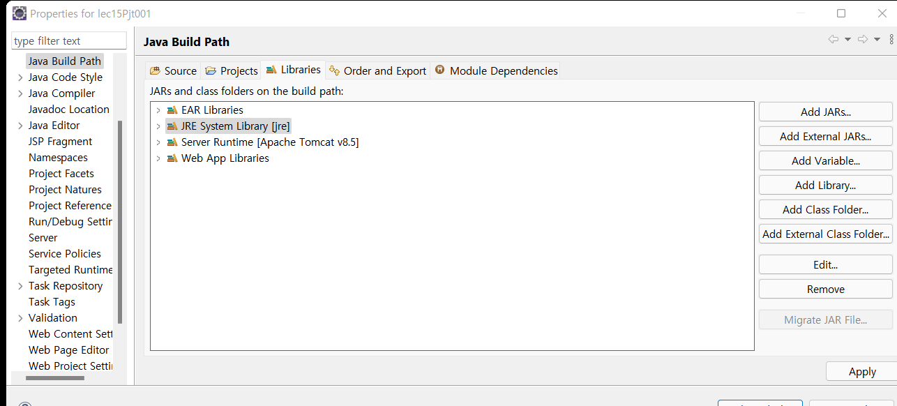 JRE System Library [jre]로 바뀐 것을 확인할 수 있습니다.