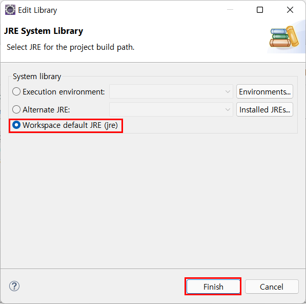 Workspace default JRE (jre)를 누르고 Finish를 하면 끝입니다.