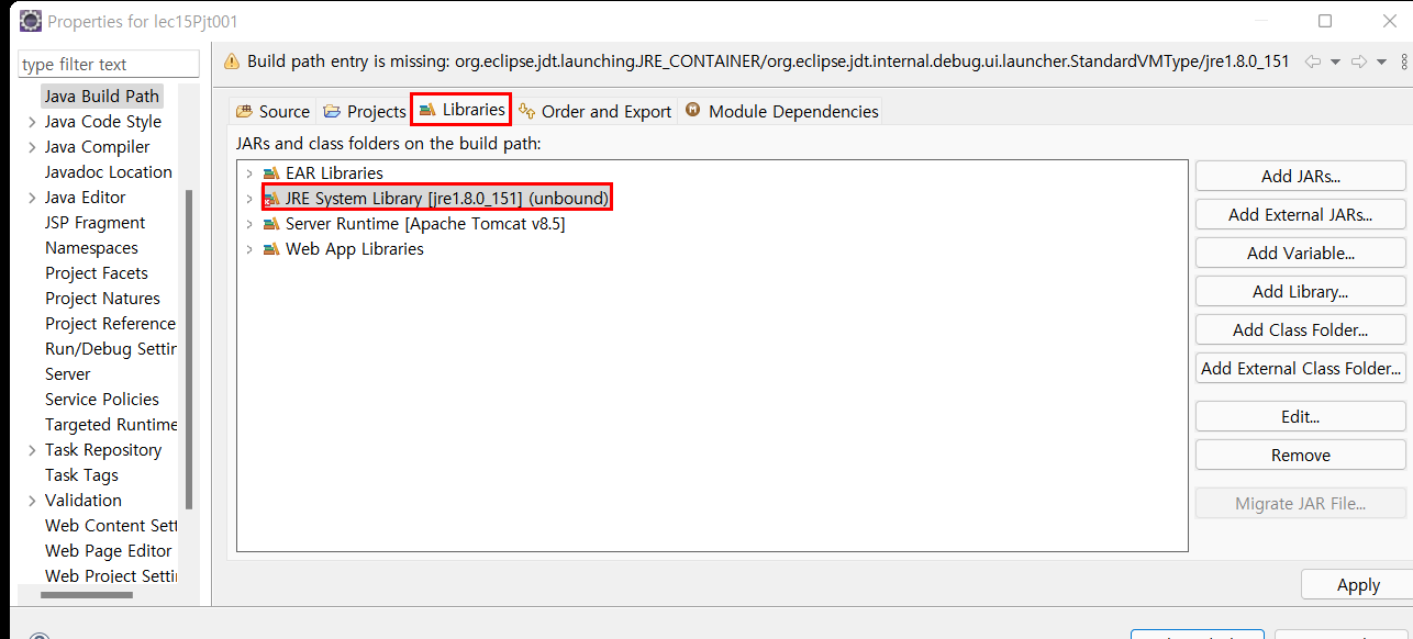 Libraries에 JRE System Library [jre1.8.0_151] (unbound)를 더블클릭 해주세요.