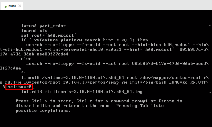 2. selinux=0 을 추가해준다.