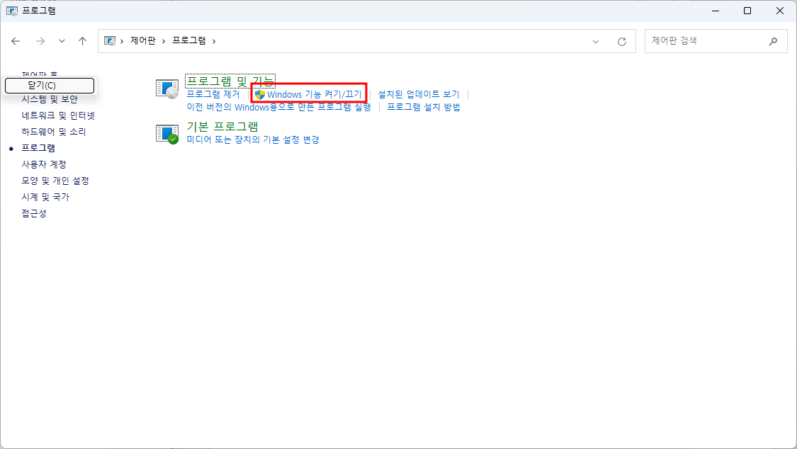 1. 제어판 > 프로그램 > Windows 기능 켜기/끄기